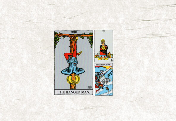 ワンド4の棒は、高く据え付けられています。情熱や気力を高く保つことが、棒の先にくくりつけられた果実(平和)を生み出すと解釈しています。