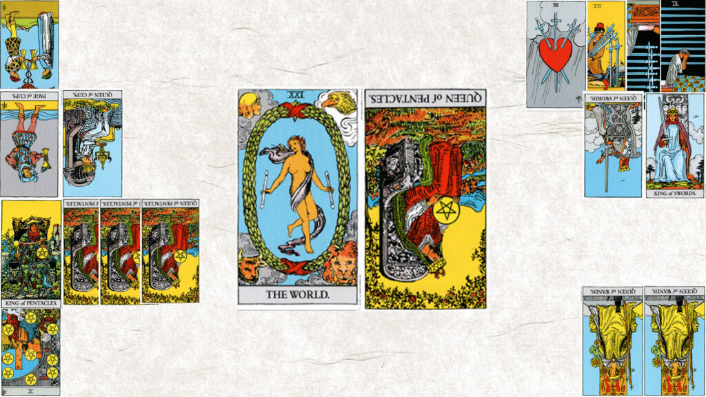今月のテーマは【ⅩⅩⅠ 世界】。鍵をくださいと一枚引いたら、ペンタクルクィーン逆位置