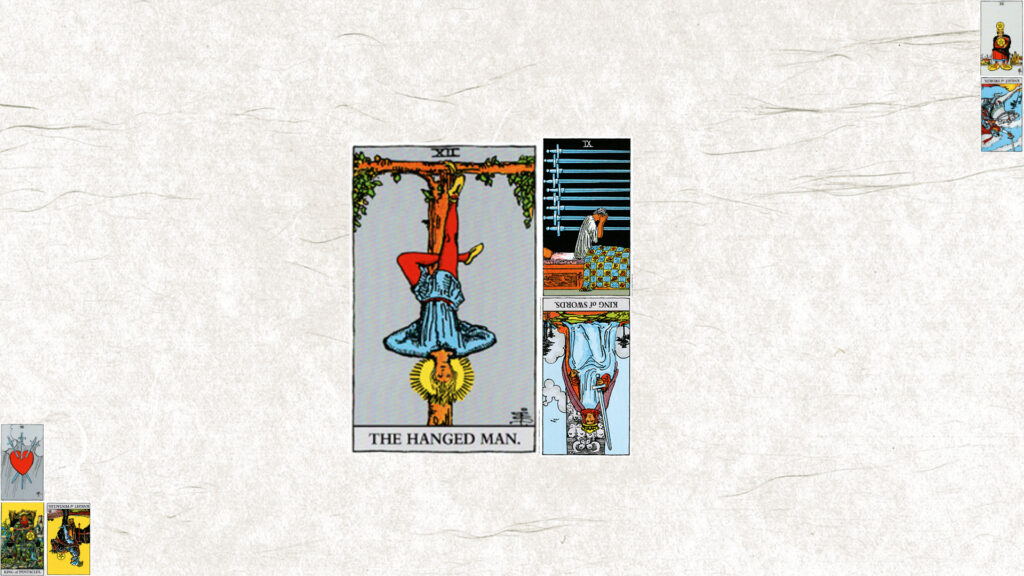 【ⅩⅡ 吊るし人】・ソード9正位置・ソードキング逆位置