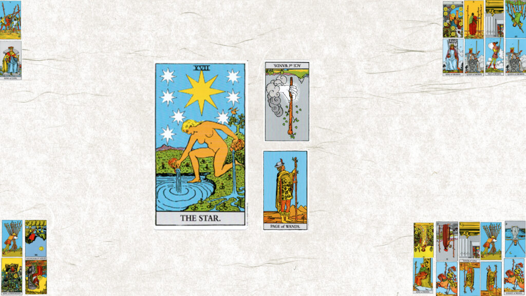 今月のテーマは【ⅩⅦ 星】。今日の鍵をくださいと二枚引いたら、ワンドエース逆位置とワンドペイジ正位置