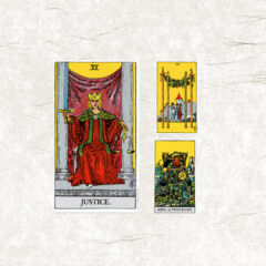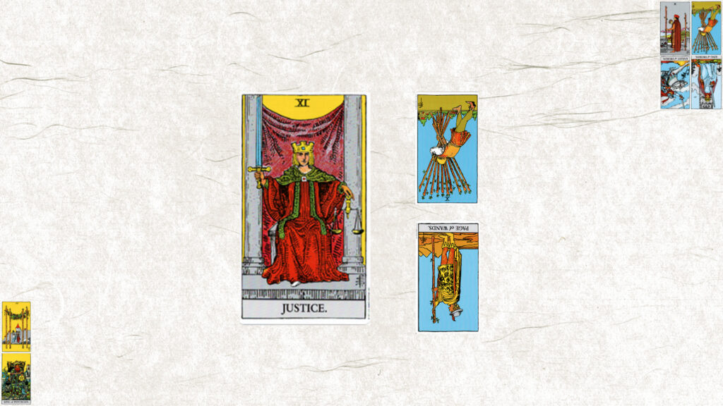 今月のテーマは【ⅩⅠ 正義】。今日の鍵をくださいと二枚引いたら、ワンド10逆位置とワンドペイジ逆位置