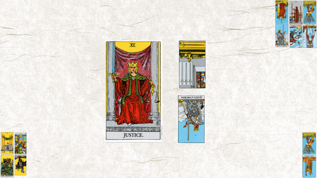 今月のテーマは【ⅩⅠ 正義】。今日の鍵をくださいと二枚引いたら、ソード4逆位置とソードクィーン逆位置
