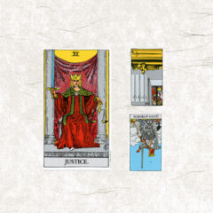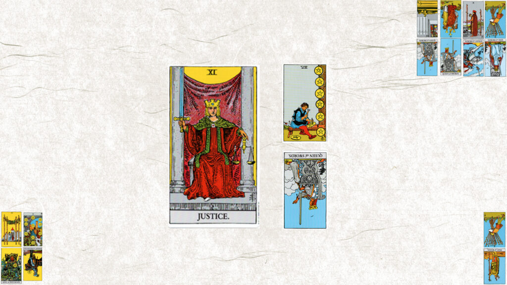 今月のテーマは【ⅩⅠ 正義】。今日の鍵をくださいと二枚引いたら、ペンタクル8とソードクィーン逆位置