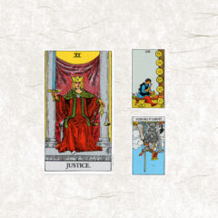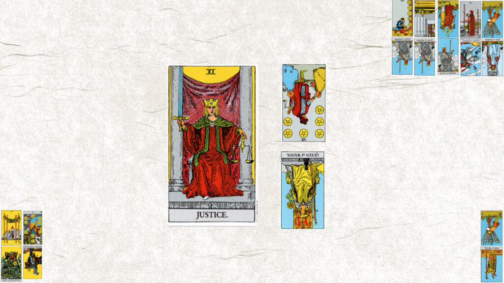 今月のテーマは【ⅩⅠ 正義】。今日の鍵をくださいと二枚引いたら、ペンタクル6逆位置とワンドクィーン逆位置