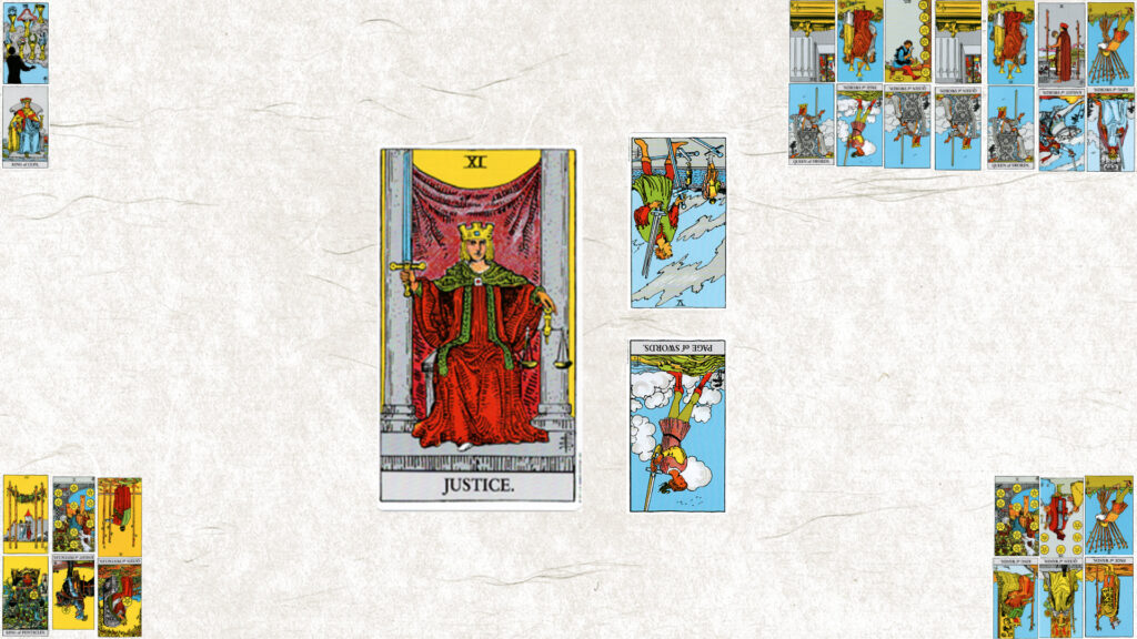今月のテーマは【ⅩⅠ 正義】。今日の鍵をくださいと二枚引いたら、ソード5逆位置とソードペイジ逆位置