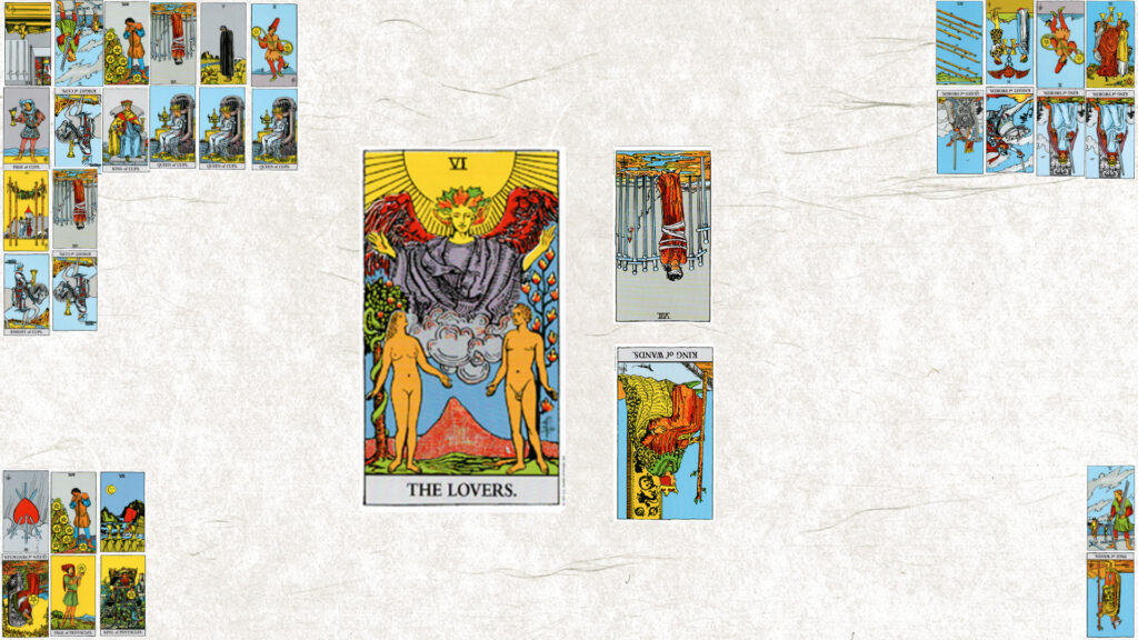今月のテーマは【Ⅵ 恋人たち】。今日の鍵をくださいと二枚引いたら、ソード8逆位置とワンドキング逆位置