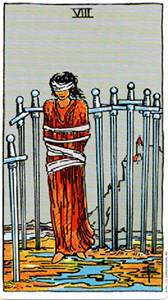 ソードは思考、言葉、認識、判断を象徴します。このカードは、自分の思い込みや(出来ない)という判断で動きが止まっている状態を暗示します。