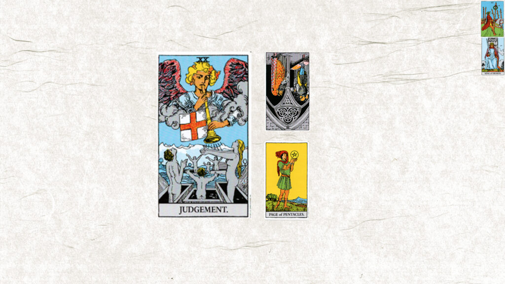今月のテーマは【ⅩⅩ 審判】。今日の鍵をくださいと二枚引いたら、ペンタクル3逆位置とペンタクルペイジ正位置