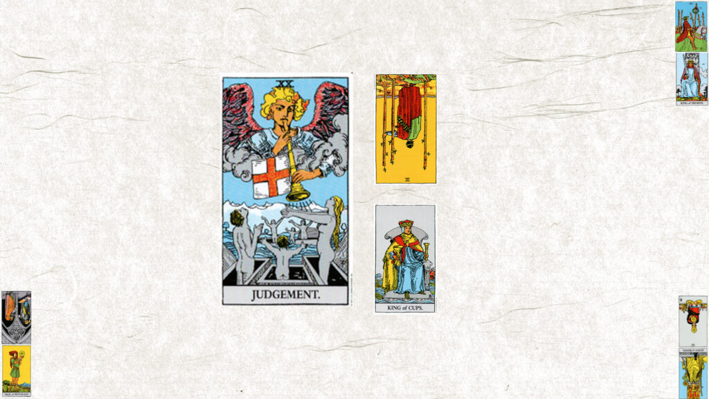 今月のテーマは【ⅩⅩ 審判】。今日の鍵をくださいと二枚引いたら、ワンド3逆位置とカップキング正位置