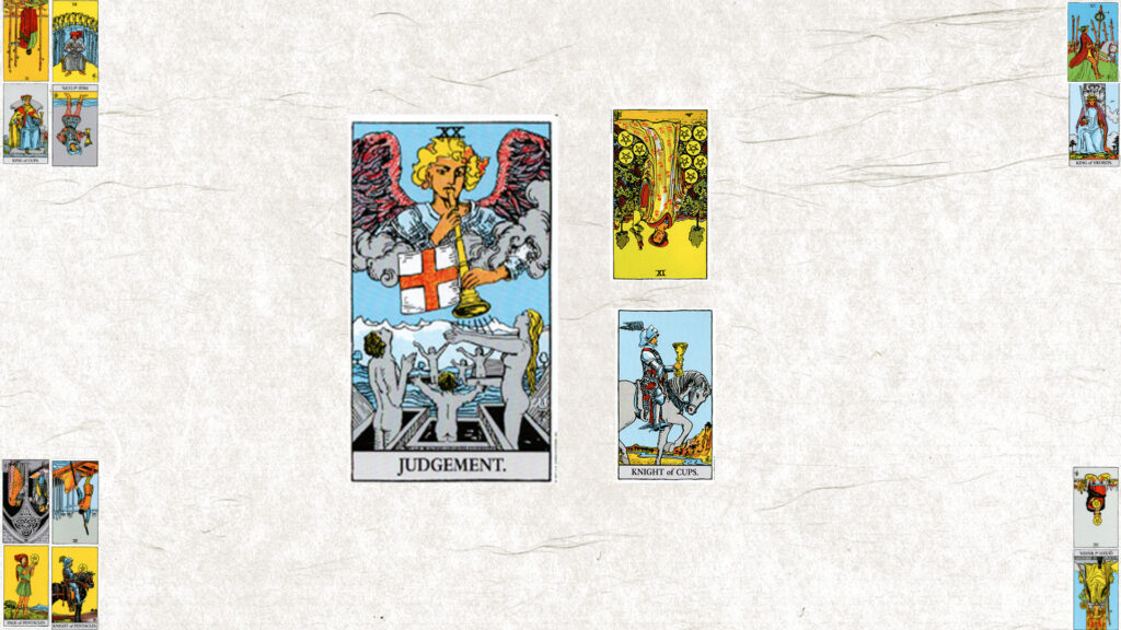 今月のテーマは【ⅩⅩ 審判】。今日の鍵をくださいと二枚引いたら、ペンタクル9逆位置とカップナイト正位置