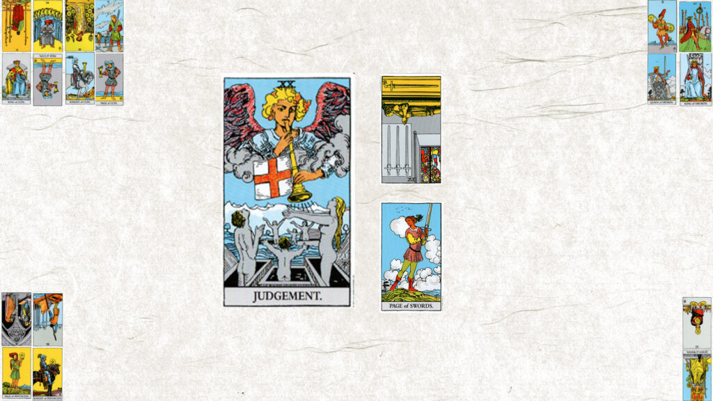 今月のテーマは【ⅩⅩ 審判】。今日の鍵をくださいと二枚引いたら、ソード4逆位置とソードペイジ正位置