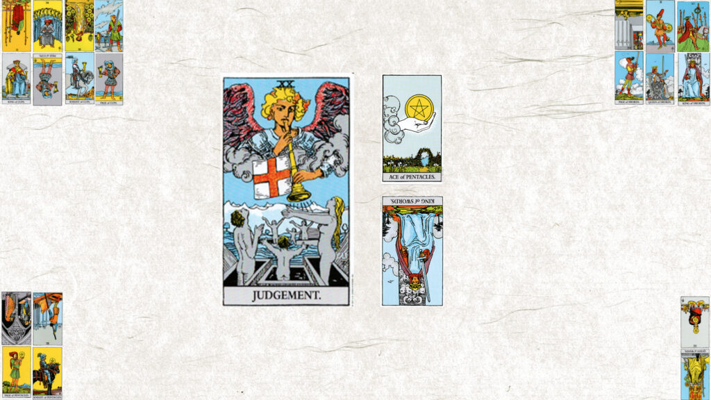 今月のテーマは【ⅩⅩ 審判】。今日の鍵をくださいと二枚引いたら、ペンタクルエース正位置とソードキング逆位置