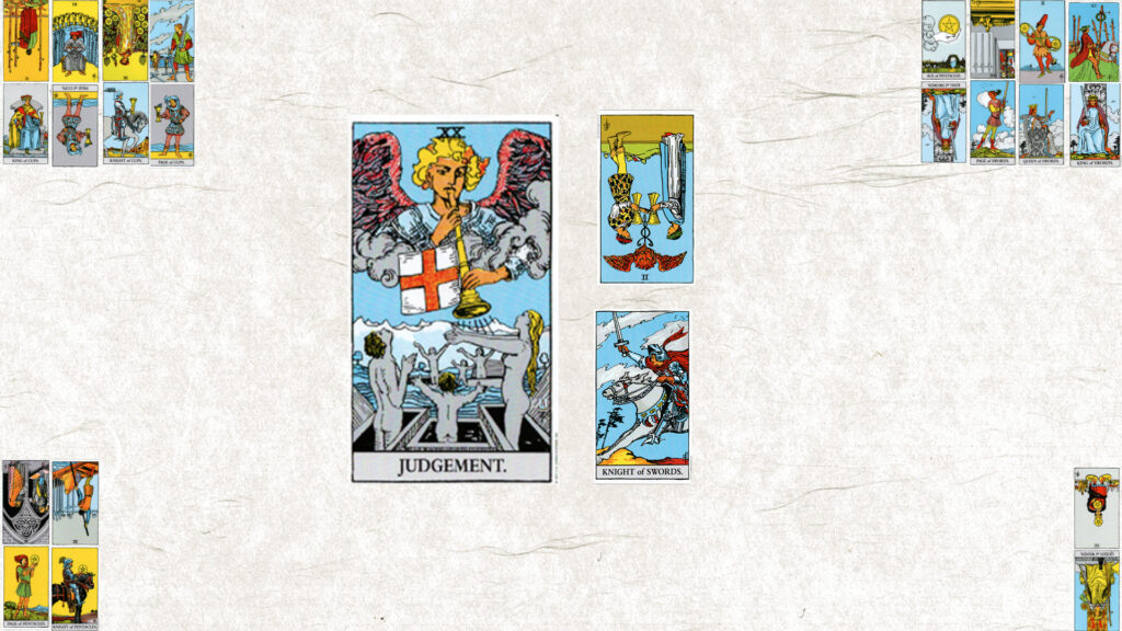 今月のテーマは【ⅩⅩ 審判】。今日の鍵をくださいと二枚引いたら、カップ2逆位置とソードナイト正位置