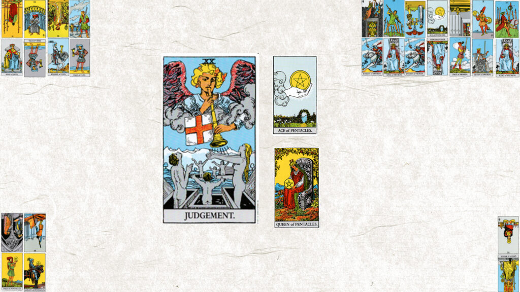 今月のテーマは【ⅩⅩ 審判】。今日の鍵をくださいと二枚引いたら、ペンタクルエース正位置とペンタクルクィーン正位置