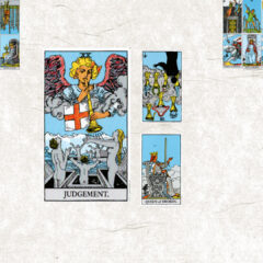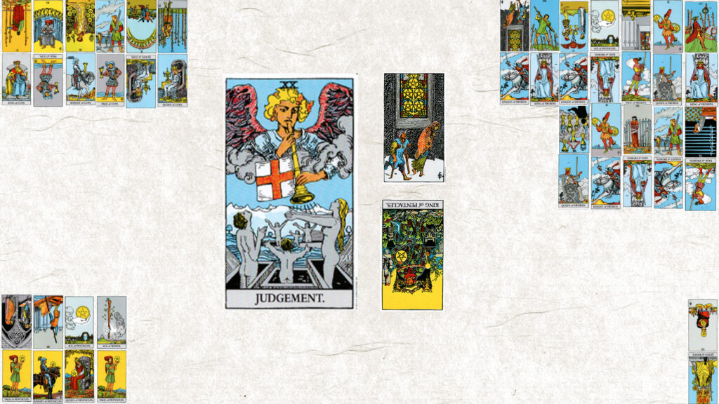 今月のテーマは【ⅩⅩ 審判】。今日の鍵をくださいと二枚引いたら、ペンタクル5正位置とペンタクルキング逆位置