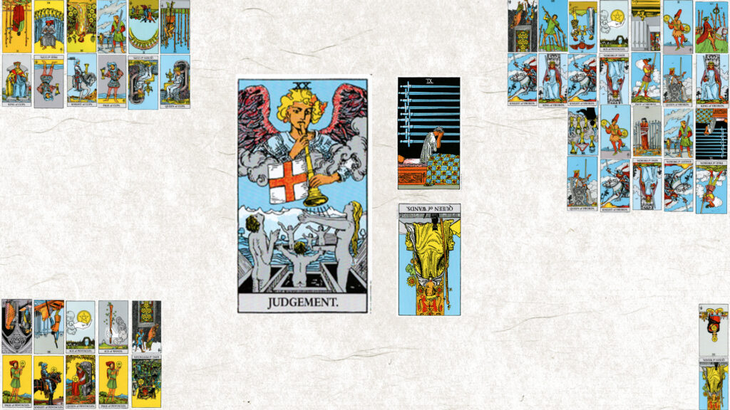 今月のテーマは【ⅩⅩ 審判】。今日の鍵をくださいと二枚引いたら、ソード9正位置とワンドクィーン逆位置