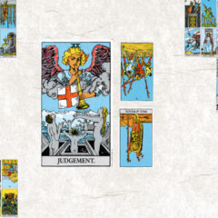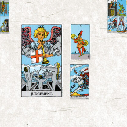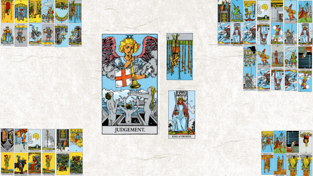 今月のテーマは【ⅩⅩ 審判】。今日の鍵をくださいと二枚引いたら、ワンド9逆位置とソードキング正位置
